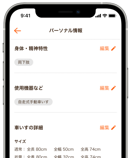 必要なサポートや車いすのサイズなどの登録で、窓口での伝達をスムーズにします。